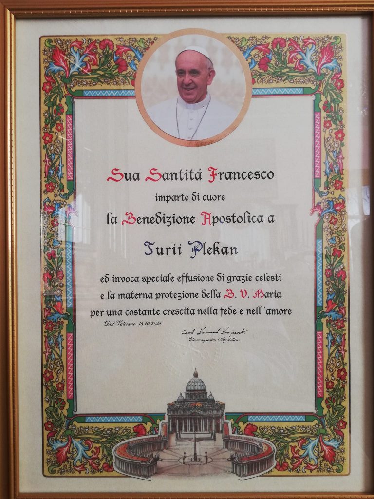 21 листопада 2021 року з нагоди святкування 150-річчя з часу освячення Собору Святого Архистратига Михаїла в Коломиї відбулась урочиста архієрейська літургія. На літургії директор Коломийського навчально-наукового інституту отримав благословення Папи Римського Франциска, у якій зазначено: “Його Святість Франческо сердечно дає апостольське благословення Юрію Плекану і закликає особливу небесну благодать і материнський захист Святої Марії для зростання у вірі та любові. Від Франческа. 15.10.2021”.
