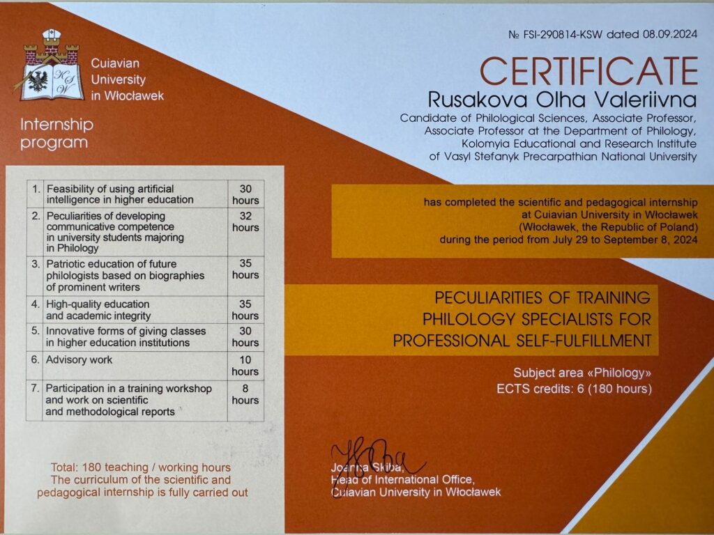 Доцент кафедри філології Русакова Ольга Валеріївна пройшла міжнародне науково-педагогічне стажування в Польщі