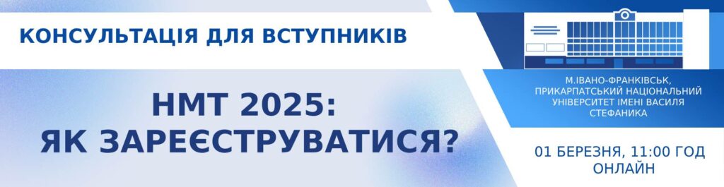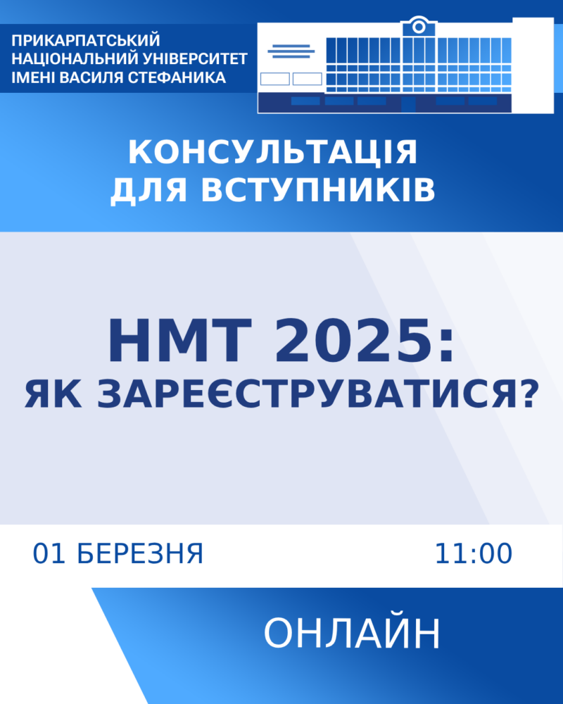 До уваги вступників 2025 року! З 6 березня 2025 року стартує реєстрація на національний мультипредметний тест (НМТ). Детальніше про порядок проведення НМТ-2025 можна дізнатися за посиланням: https://testportal.gov.ua/nmt-2025-poryadok-provedennya/ ???? Приєднуйтесь до консультації на офіційній сторінці Приймальної комісії Прикарпатського національного університету в Читати далі