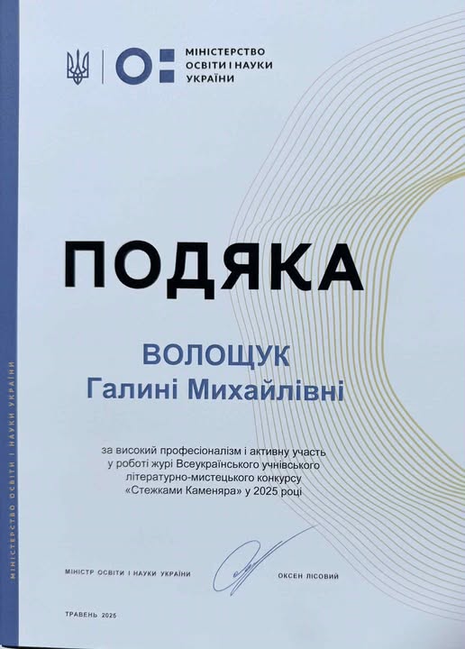 Міністерство освіти і науки України висловило Подяку Галині Михайлівні за її високий професіоналізм та активну участь у роботі журі Всеукраїнського учнівського літературно-мистецького конкурсу «Стежками Каменяра» у 2025 році. Ця відзнака є свідченням не лише високої кваліфікації та відданості своїй справі Читати далі