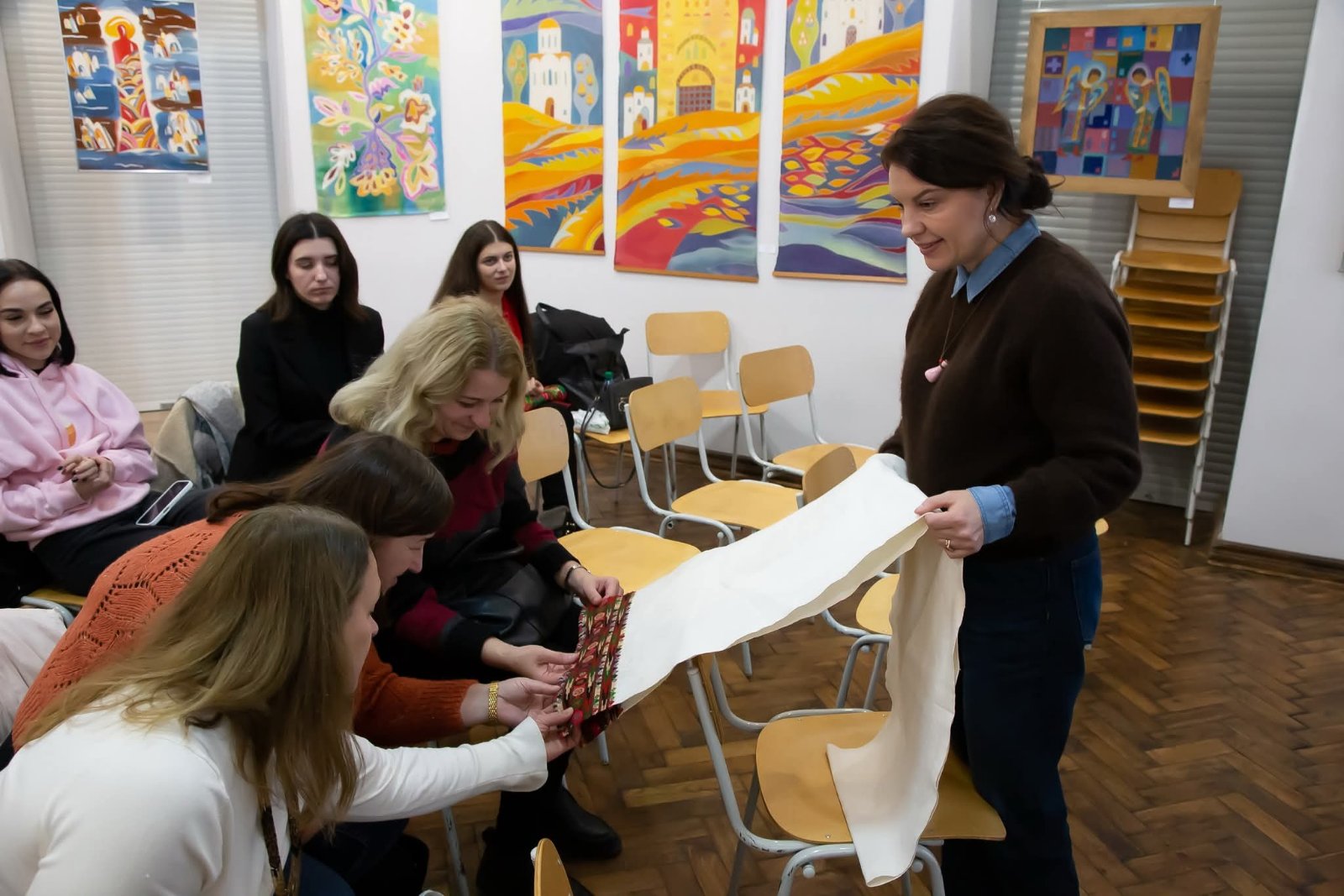 Лекція-майстерка, що відбулася напередодні Всесвітнього дня української хустки, викликала щире зацікавлення серед учасниць. Присутні дізналися про різновиди традиційних хусток і переміток, їхнє символічне значення, регіональні відмінності та побутове застосування. Під час практичної частини всі охочі мали нагоду приміряти автентичні головні убори та спробувати техніки їх традиційного пов’язування.